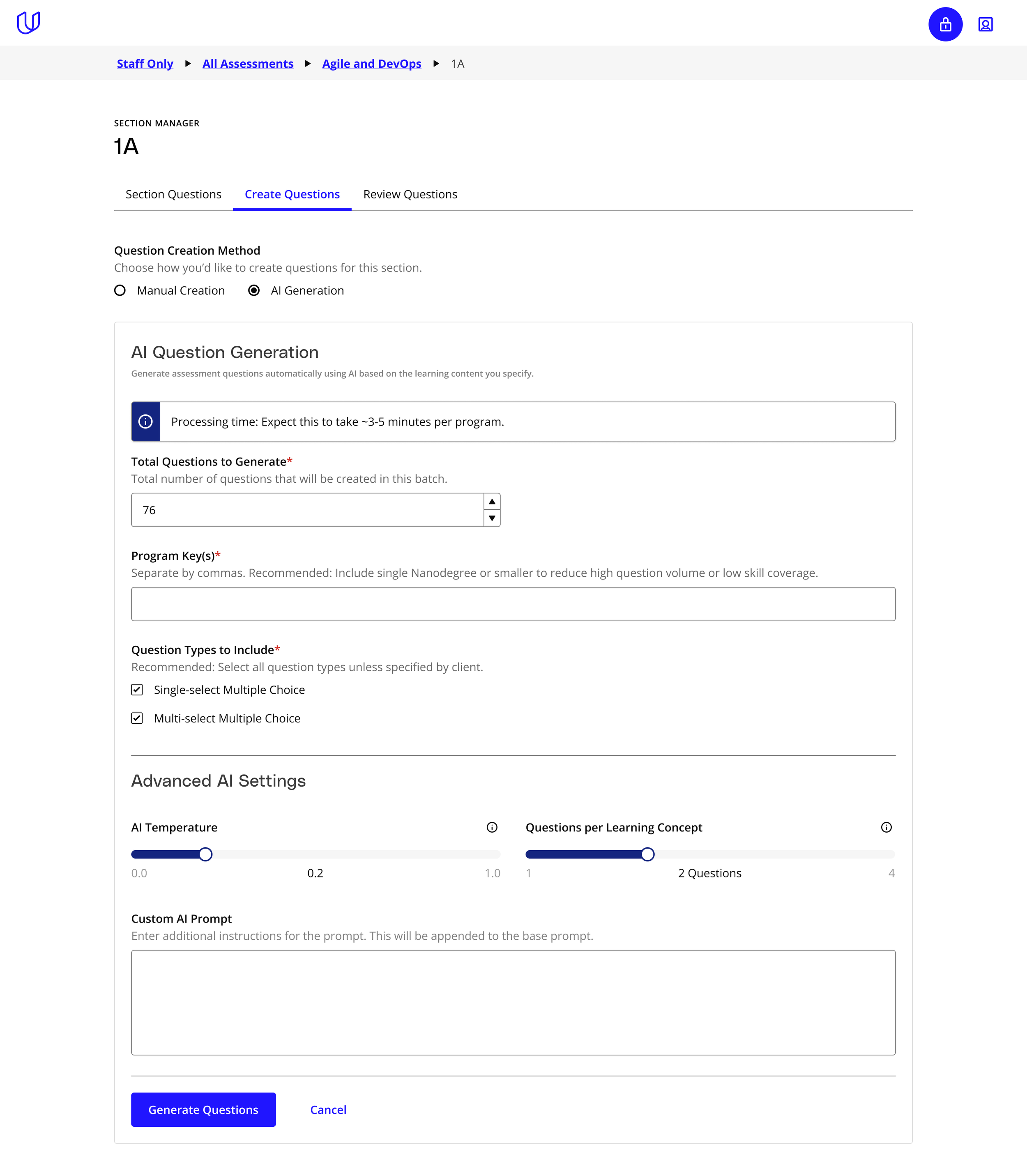 I led the design of an AI-enhanced assessment creation and management system within Udacity’s enterprise management platform, enabling internal teams to quickly create, review, edit, and maintain assessments—using both manual and AI-generated questions—under significant time and technical constraints.